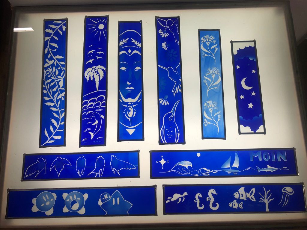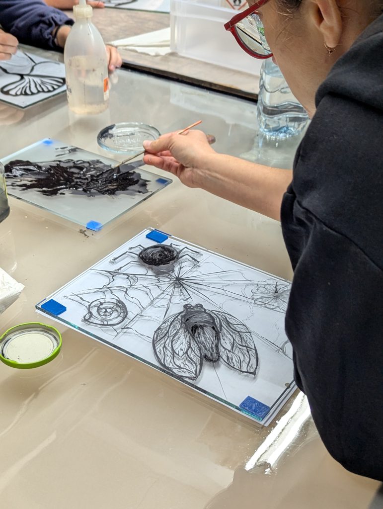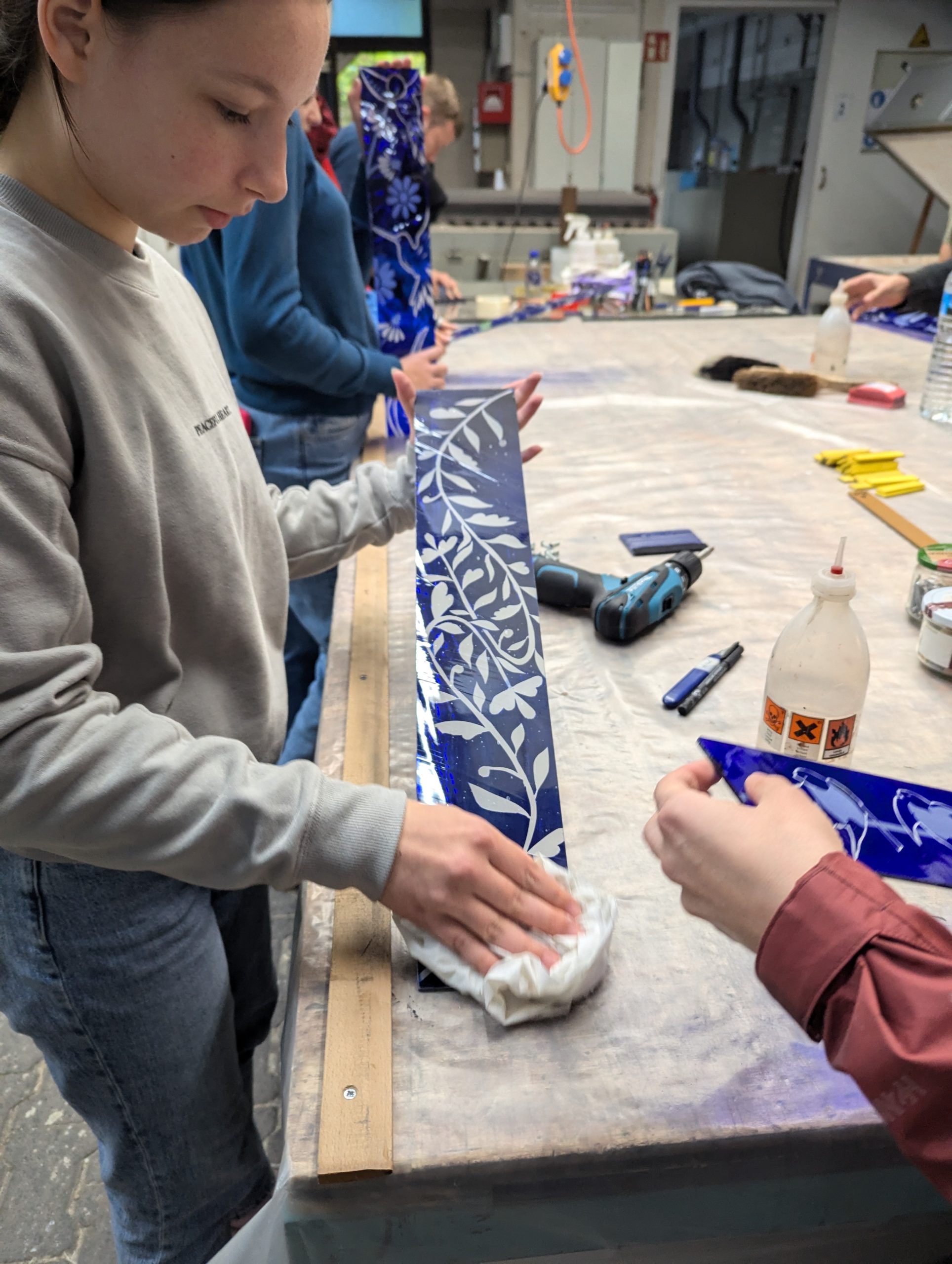 Im Rahmen des Projekts entwarfen sie zwei Glasstücke – eines wurde kunstvoll bemalt, während das andere durch Sandstrahlen veredelt wurde. Für den Sandstrahlprozess fertigten sie mithilfe einer Folie individuelle Muster an, die sie präzise ausschnitten und auf das Glas übertrugen. Diese Techniken boten ihnen die Möglichkeit, ihre eigenen Ideen frei zu entfalten und einzigartige Designs zu schaffen.