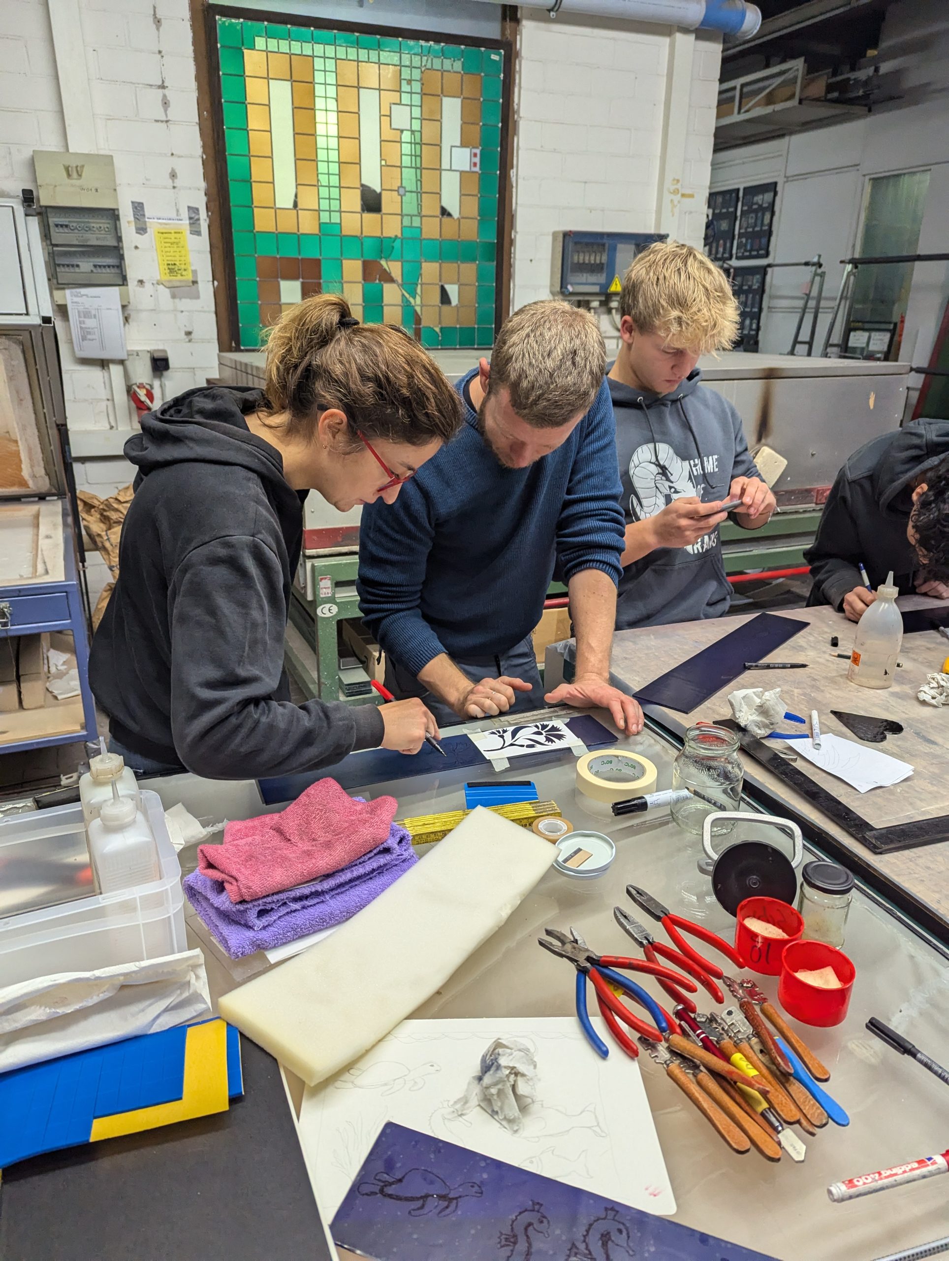 Begleitet von unseren erfahrenen Mitarbeiter:innen erlernten die Praktikanten:innen außerdem die Grundlagen der Bleiverglasung und vollendeten damit ihre gestalteten Gläser.